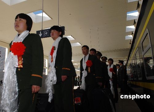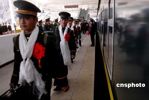 11月25日,駐藏某部及武警西藏森林總隊(duì)的退伍老兵們?cè)趹?zhàn)友和拉薩當(dāng)?shù)厝罕姷臍g送下踏上了回家的青鐵列車。從有關(guān)部門獲悉,拉薩火車站已經(jīng)為新老兵準(zhǔn)備了充足的車輛和票額。另據(jù)了解,今年鐵路新老兵運(yùn)輸將繼續(xù)執(zhí)行購(gòu)票、行李托運(yùn)、進(jìn)出站和中轉(zhuǎn)換乘“四優(yōu)先”原則,為新老兵排憂解難、提供方便,確保新老兵乘車有票、上車有座,退伍老兵在旅客列車上用餐也將享受優(yōu)惠。 中新社發(fā) 龍昊 攝