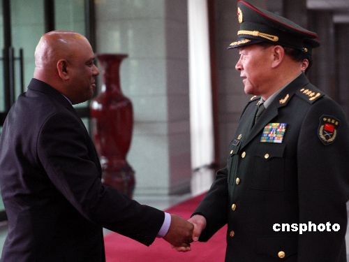 2月19日下午,國務委員兼國防部長梁光烈上將在北京八一大樓會見來訪的馬爾代夫國防與國家安全部長費薩爾一行。中新社發 宋吉河 攝