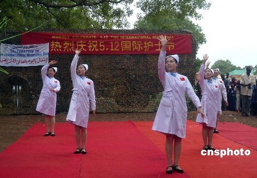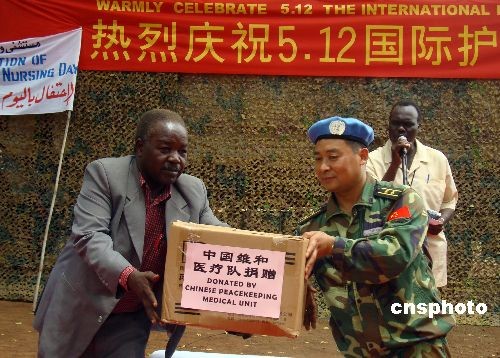 5月11日,中國赴蘇丹維和醫(yī)療隊(duì)醫(yī)護(hù)人員與蘇丹西加扎勒河州州立醫(yī)院的同行們歡聚一堂,慶祝國際護(hù)士節(jié)。歡慶活動(dòng)中,我維和醫(yī)療隊(duì)捐贈(zèng)了該院急需的抗生素、抗瘧疾、醫(yī)用耗材等六大類近50個(gè)品種的醫(yī)療物資,醫(yī)療隊(duì)將與州立醫(yī)院開展更廣泛的醫(yī)護(hù)交流和合作,為改善當(dāng)?shù)氐尼t(yī)療衛(wèi)生狀況做出力所能及的貢獻(xiàn)。熱情淳樸的當(dāng)?shù)孛癖娪米盥≈氐亩Y遇接待了中國朋友們。中新社發(fā) 隗蒙 陳晨 攝