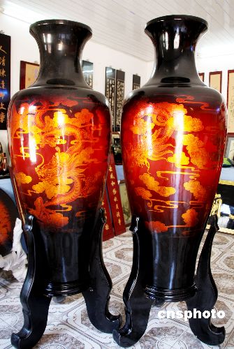 圖:中國最高的一對脫胎漆器金龍瓶亮相江西鄱陽