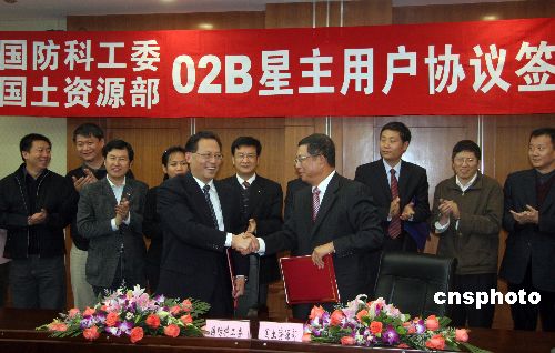 十月二十九日下午,中國國防科學技術工業委員會與國土資源部簽署協議,后者正式成為中巴地球資源衛星○二B星主用戶,雙方將以此為契機,攜手推動并充分發揮中巴地球資源衛星○二B星的應用效益。國防科工委副主任兼國家航天局局長孫來燕(左)、國土資源部副部長李元代表雙方簽署《國防科工委、國土資源部關于中巴地球資源衛星○二B星主用戶機制試點的協議》。中新社發 孫自法 攝