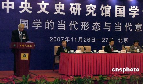 經中國國務院批準,中央文史研究館國學論壇二十六日在北京舉行。論壇主題是:國學的當代形態和當代意義。共有全國文史研究館館員以及中國社會科學院、北京大學、中國人民大學國學專家,香港、澳門、臺灣地區專家學者五十人出席。中新社發 徐長安 攝