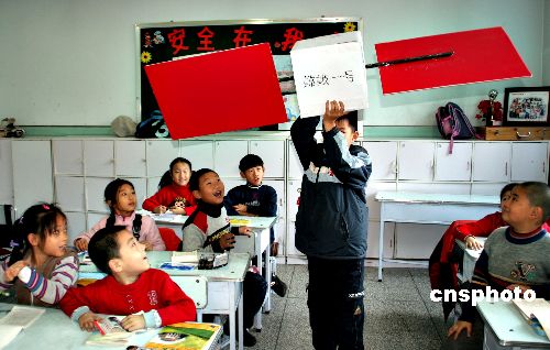 11月27日,哈爾濱市江沿小學藝術班的同學在展示他們制做“嫦娥一號”的模型。中新社發 姚庭山 攝