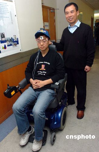 圖為徐揚生教授〔右一〕向傳媒介紹其新研發的以頭部或眼球動作操控的智能輪椅。