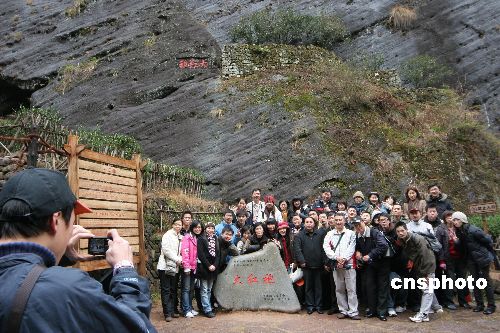 一月二十七日上午,兩岸三校師生在福建武夷山景區(qū)的大紅袍古老茶樹下合影留念。二十三日至二十七日,臺灣嘉義大學(xué)、臺灣屏東科技大學(xué)與福建農(nóng)林大學(xué)的四十位師生在此間開展茶文化之旅,探尋當(dāng)?shù)氐牟栉幕V行律绨l(fā) 周文杰 攝