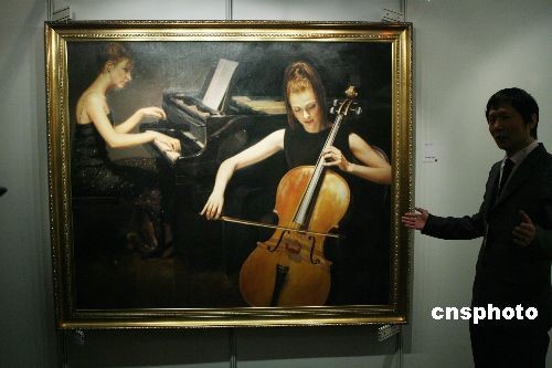 四月五日,中國嘉德二零零八春季拍賣巡展在香港舉行,八十年代陳逸飛音樂題材肖像作品系列之一的《二重奏》估價八百萬至一千萬元人民幣。中新社發 武仲林 攝