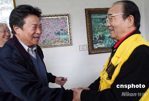 4月15日,以北京植物園景觀為專題的“王石之油畫展”在植物園盆景園內(nèi)開幕,是次畫展是由曾畫毛澤東巨像的中國著名畫家王石之創(chuàng)作完成,展出的40幅油畫都是以一畫一景的形式從植物園的春天到冬天不同季節(jié),不同區(qū)域的自然風光、園林美景、人文古跡等優(yōu)美景觀。圖為李光曦(左)與高占祥出席開幕式。中新社發(fā) 錢興強 攝