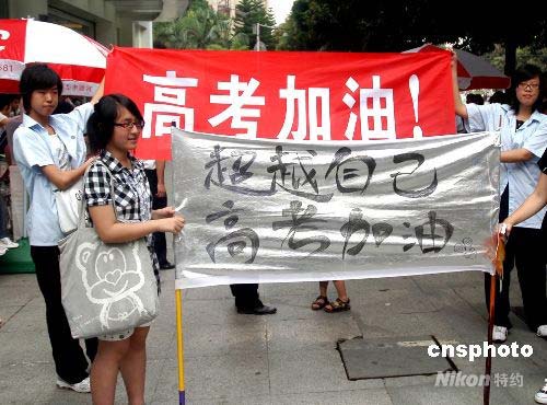 2008年6月7日,福州三中考點(diǎn),該校高一的學(xué)弟學(xué)妹們拉起“超越自己,高考加油”的橫幅為參加考試的學(xué)長(zhǎng)們加油,同時(shí)也親身體驗(yàn)一下高考的緊張氛圍。中新社發(fā) 張 斌 攝