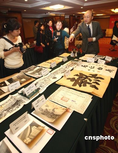 十月十六日,四百余件華僑華人捐贈(zèng)的藏品首次在北京華僑飯店亮相。由中國(guó)華僑歷史博物館接受的這些藏品反映了上個(gè)世紀(jì)海外華僑生存和發(fā)展的歷史,見(jiàn)證了華僑華人與祖國(guó)共命運(yùn),共發(fā)展的史實(shí)。目前,中國(guó)華僑歷史博物館正在籌建中。中新社發(fā) 史利 攝