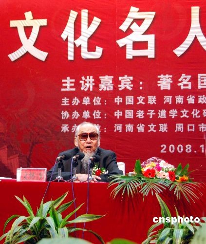 10月21日,著名國學大師文懷沙在名人講壇上縱論老子,博得全場陣陣掌聲。10月20日晚,“2008中國鹿邑國際老子文化節”在老子故里河南省鹿邑縣召開,98歲高齡的著名國學大師文懷沙出席了開幕式。據悉,本屆文化節由中國文聯、政協河南省委員會、中國國際文化傳播中心主辦,為期兩天,以“建設民族精神家園——尊道·貴德·和諧·發展”為主題,包括老子文化高層論壇、國學大師文懷沙報告會、經貿合作與簽約儀式等活動。 鹿邑縣位于河南省東部,是道家學派創始人老子的故里,被稱為“道家之源,道教祖庭,李姓之根”。中新社發 蔣保慶 攝