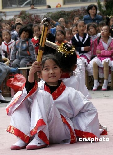 10月29日,山東威海長峰小學在校園內(nèi)以“詩詞曲賦潤心田 傳統(tǒng)文化駐校園”為主題開展校園文化節(jié)活動。在文化節(jié)上,學生們將在《論語》、《弟子規(guī)》等經(jīng)典課本所學、所悟、所得,在老師的指導下,編排成節(jié)目展示出來。 據(jù)介紹,兩年來,學校通過以經(jīng)典古文誦讀為突破口,使傳統(tǒng)文化常駐校園。中新社發(fā) 海云飛 攝