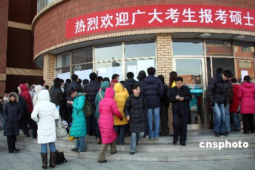 1月9日,山東濱州眾多參加碩士研究生考試的學子蜂擁到山東濱州學院考點,提前確認考場。據悉,山東濱州共有3800余名考生報名參加。1月10日,2009年全國碩士研究生入學統一考試開考,共有124.6萬名考生在全國各地應試。中新社發 郭志華 攝