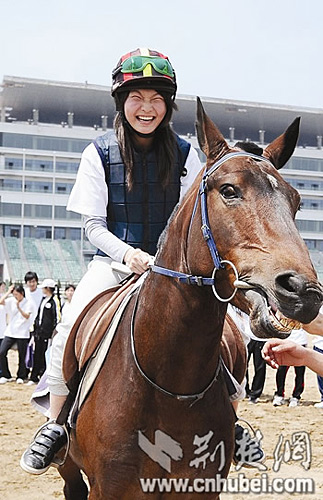 董敏緊緊地拉住韁繩。賽馬乖乖地站定后,她的臉上綻出開心的笑容(如圖)。