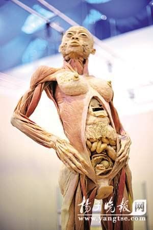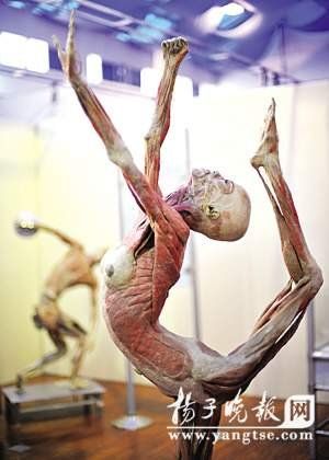 現場的講解員告訴記者,現在的標本都是塑化技術,這是上世紀70年代由德國人哈根思發明的,中國于2000年引進。過去用福爾馬林浸泡的標本易變色、易變形,保存時間也不長。而塑化保存的標本都是經過了脫水、脫脂,所有現在我們所看到的都是肌肉組織,看起來也就更勻稱和美觀,而經過這樣一項技術,標本可以保存500年之久,“可以稱得上現代木乃伊了。”