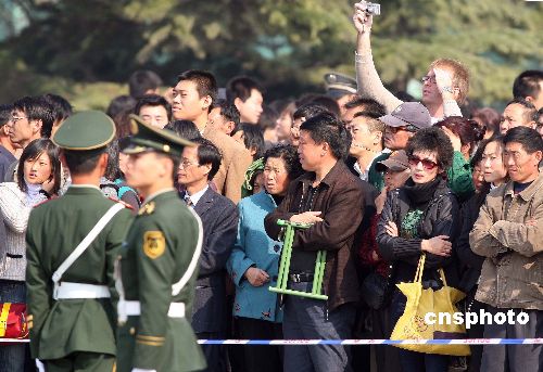 十月二十一日,中國共產黨第十七次全國代表大會在北京人民大會堂閉幕,天安門廣場外聚集許多關注大會盛況的民眾。中新社發 毛建軍 攝