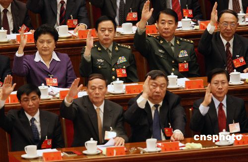 圖為當(dāng)選中共第十七屆中央委員會(huì)委員的劉延?xùn)|、劉冬冬、劉源、劉鵬(后排從左至右)和王滬寧、王岐山、王旭東、王東明(前排從左至右)等舉手通過決議。