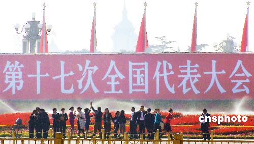 10月21日,中國共產(chǎn)黨第十七次全國代表大會在北京人民大會堂勝利閉幕。一些大會工作人員在天安門廣場留影。中新社發(fā) 鄭雄增 攝