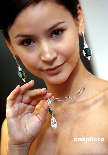 模特展示31.92卡拉足色全美鉆石吊墜、17.01 及17.71卡拉哥倫比亞綠寶石及鉆石耳環(huán)。