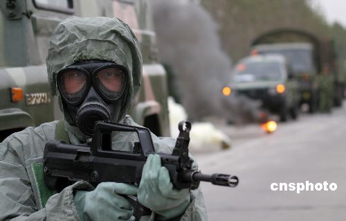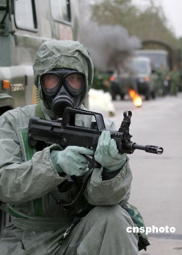 10月27日,“鐵拳-2007”實兵檢驗性演習拉開帷幕。10月28日,鐵拳2007機步師實兵檢驗性演習部隊在機動途中展開防持久毒劑襲擊,化學偵察,道路消毒,裝備消毒,人員消毒等科目演練。中新社發 曾憲平 攝