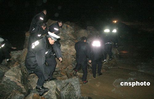 威海、煙臺兩地民警在出事海域海邊的石壩上搜尋。