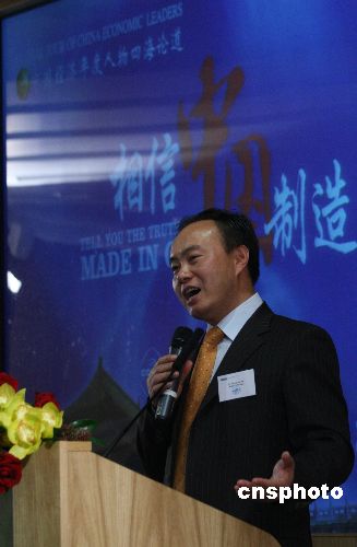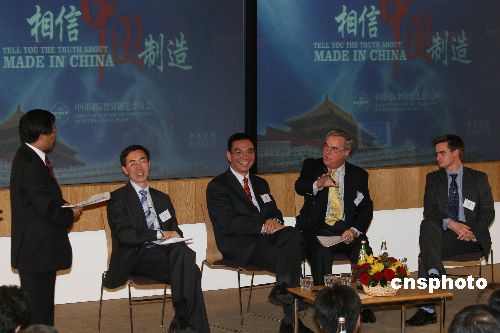 圖為英國諾丁漢大學教授姚樹潔 、中國駐英使館政治參贊劉為民、北京大學中國經濟研究中心主任林毅夫、英中貿易協會主席白樂威和英國諾丁漢大學講師薩瑟蘭(自左至右)就“中國制造”的話題進行討論。