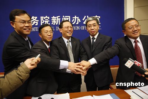 11月26日下午,繞月探測工程領導小組副組長、國防科工委副主任、航天局局長孫來燕(中),繞月探測工程測控系統副總指揮、北京航天飛行控制中心主任朱民才(左二),繞月探測工程副總指揮、航天科技集團公司副總經理雷凡培(右二),中國科學院空間科學與應用中心主任吳季(右)以及國新辦新聞局副局長華清(左),在國務院新聞辦公室舉行的新聞發布會上,共同慶祝中國首次月球探測工程的圓滿成功。當日,國務院新聞辦公室邀請中國繞月探測工程領導小組副組長、國防科工委副主任、國家航天局局長孫來燕等介紹中國首次月球探測工程等方面情況,并答記者問。中新社發 杜洋 攝