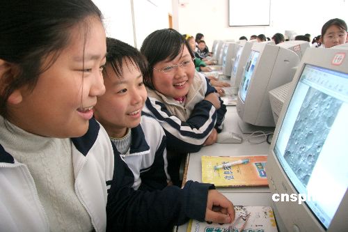 11月27日,威海古寨中學的學生上網查看“嫦娥一號”衛星傳回的第一幅月面圖像。當日,威海一中學開展“學科技激發航天熱”活動,同學們通過上網查看、老師講解、小組討論等形式了解“嫦娥一號”衛星及其相關的天文知識。中新社發 海云飛 攝