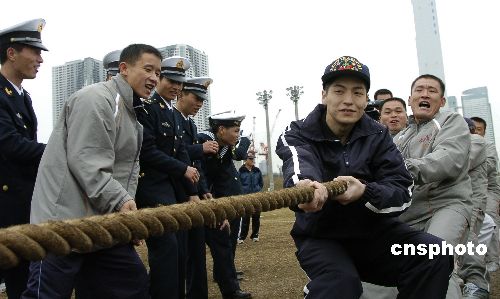 圖:“深圳”號驅逐艦官兵在日參加拔河比賽