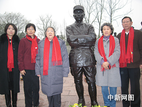 周秉德(周恩來侄女,右二)、李敏(左三)、周秉鈞(周恩來侄子,右一)、劉軍鷹(周恩來侄媳,左二)、孔東梅(左一)在周恩來塑像前合影。淮黎霞 攝