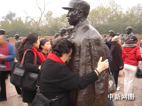 左權(quán)將軍女兒左太北淚流滿面緊緊擁抱父親塑像,久久不愿離去。淮黎霞 攝