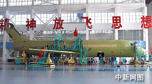 中國首架自主知識產權的噴氣支線客機ARJ21正在總裝中。