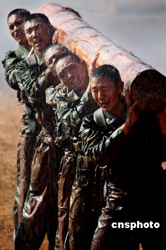 圖為中國(guó)士兵訓(xùn)練扛圓木。