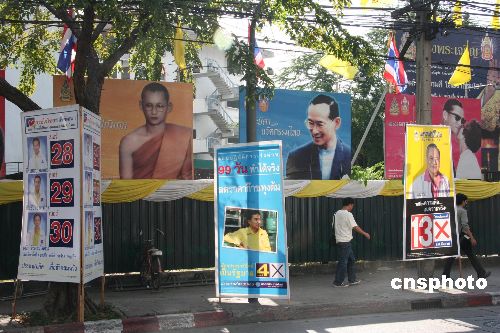 圖為曼谷市區(qū)的競選廣告牌,中間四號牌為新總理人選呼聲甚高的民主黨黨魁阿披實。