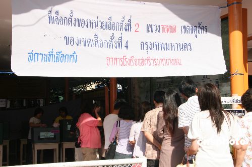 圖為設(shè)在曼谷拉察喲庭路的一個投票點,選民在排隊踴躍投票。