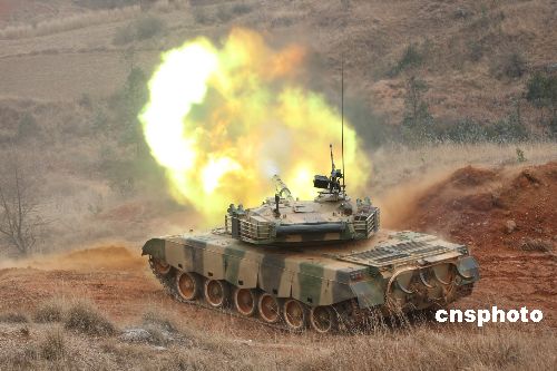 圖為訓練中,中方坦克分隊對恐怖分子實施武力打擊。