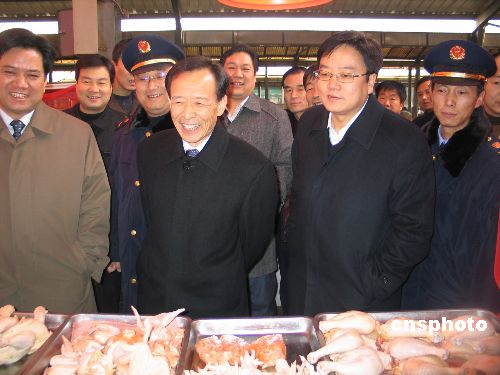 十二月二十八日,全國產品質量和食品安全專項整治行動驗收組在西安抽查。圖為國家質檢總局副局長蒲長城(前排左二)檢查0六七綜合市場,與攤販笑談雞肉價格。中新社發 冽瑋 攝