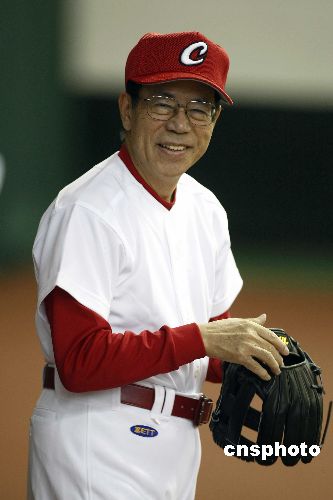 溫家寶身著35號球衣應約和福田康夫切磋棒球球藝
