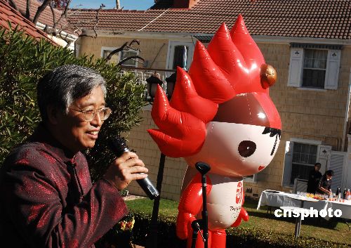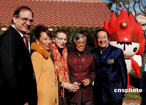 當地時間一月十二日,中國駐洛杉磯總領事張云在官邸盛邀美國政商法學界和智庫主流人士,與北京奧運會吉祥物福娃齊祝來賓中國新春佳節快樂。中新社發 賈國榮 攝