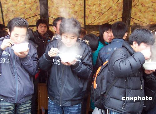 2月2日,上海站南廣場上的臨時候車棚里,“南京路上好八連”為民服務隊的官兵們帶著野炊用具為回鄉候車的旅客做飯。圖為候車旅客喝著“好八連”官兵燒的熱粥。中新社發 周東潮 攝
