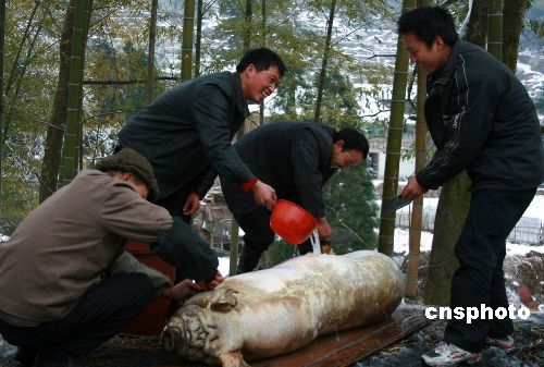 2月4日是農(nóng)歷的“立春”節(jié)氣,被冰雪封凍20多天的廣西融水縣滾貝鄉(xiāng)災(zāi)民殺豬喜迎新春。由于得到當(dāng)?shù)卣募皶r(shí)救助,面對(duì)遭受57年來(lái)最嚴(yán)重的雨雪冰凍災(zāi)害,災(zāi)民們對(duì)未來(lái)依然充滿信心。中新社發(fā) 張耀華 攝