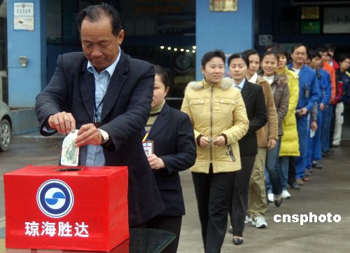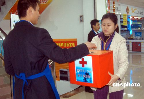 2008年2月5日,瓊海市民在踴躍捐款救災。我國南方部分地區遭受雪災牽動全國人民的心,在海南省紅十會倡議組織下,連日來海南各界群眾積極捐款捐物,向災區人民獻愛心。中新社發 蒙鐘德 攝