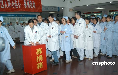 二月五日,北京世紀壇醫院職工排隊為受災的南方省、市衛生廳、局捐款。北京衛生局四日向全市衛生系統發出緊急通知,號召廣大醫務人員向冰雪災區緊急捐款。據不完全統計,截止五日,已累計捐款四百一十八萬八千元人民幣。這是北京衛生系統近年來在捐款活動中,時間最短、數量最多的一次。中新社發 曾利明 攝