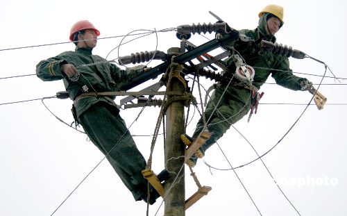 2月5日,婺源縣供電公司工作人員在贛浙皖邊界的江灣鎮大瀲村搶修。雪災造成江西省婺源縣山區大部分供電系統中斷,大山里的村民無法正常用電。國家電網公司江西省電力公司婺源縣供電公司立即組織“黨團員突擊搶修隊”和“電力110”搶修小分隊奔赴山區搶修線路。中新社發 王國紅 攝