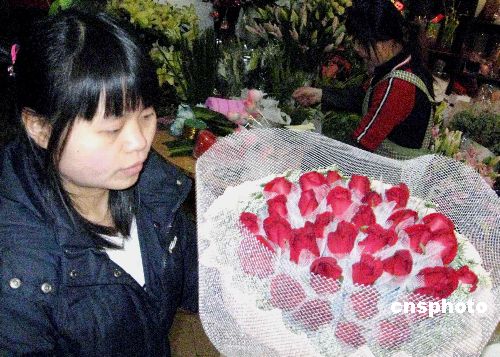 2月13日,福州市花店女店員在包裝打理供應情人節(jié)市場的紅玫瑰。情人節(jié)前夕,福州市一朵玫瑰售價高漲到15元人民幣,與平日相比身價倍增。中新社發(fā) 劉可耕 攝