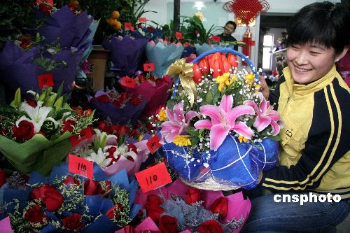 2月13日,顧客在挑選鮮花。為迎接“情人節”,山東威海各花店生意紅火,許多顧客為女友和母親訂購鮮花,鮮花市場銷售異常火爆,許多花店為此招臨時工幫忙。中新社發 海云飛 攝