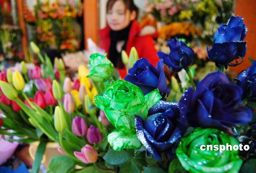 二月十三日,西方情人節將至,僑鄉泉州城大大小小花店迎來銷售高潮,由昆明引進的五彩玫瑰尤其受到僑鄉青年的青睞。中新社發 傅丹丹 攝