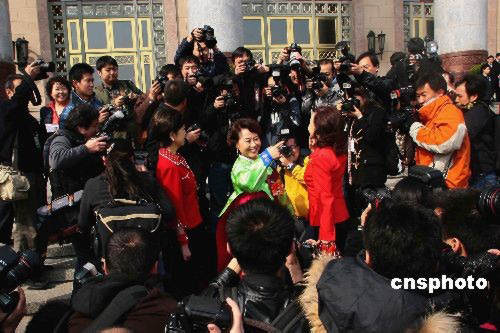 3月14日上午,全國政協十一屆一次會議完成各項議程后在北京人民大會堂閉幕。朝鮮族委員李承淑興高采烈走出會場,在大會堂前載歌載舞歡慶大會圓滿閉幕。