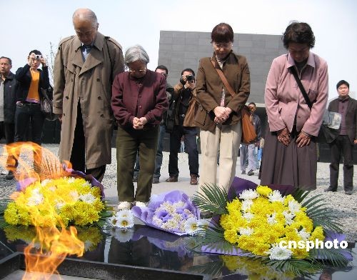 4月4日清明節(jié),在侵華日軍南京大屠殺遇難同胞紀(jì)念館祭場內(nèi),日本銘心會友好訪華團(tuán)團(tuán)長松岡環(huán)(右二)、旅日華僑中日交流促進(jìn)會秘書長林伯耀(左一)等百名日中友好人士抔土獻(xiàn)菊,祭掃南京大屠殺三十萬遇難者。中新社發(fā) 朱曉穎 攝