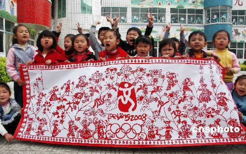4月7日,幼兒園的小朋友在參觀《華夏兒女喜迎奧運圣火》剪紙作品。近日,河南周口軍分區幼兒園老師陳雪英用兩周的時間加班制作出了一幅《華夏兒女喜迎奧運圣火》的剪紙作品。據了解,該作品邊長2.3米,寬0.75米,畫面上刻有福娃、五環、火炬、和平鴿和各民族娃娃,整幅作品用國花牡丹連接而成,四周是一百多個火炬,象征著奧運圣火在全世界巡回傳遞,整幅作品表達了華夏各族兒女喜迎奧運圣火的歡樂情景。中新社發 楊正華 攝