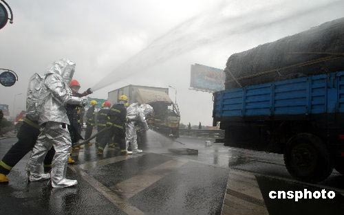 2008年4月9日,在濟(jì)青高速公路零公里處,山東省高速公路交警支隊(duì)聯(lián)合消防、醫(yī)療救護(hù)、環(huán)保等單位舉行了“迎奧運(yùn)、保暢通”模擬交通事故救援演練。演練模擬在濟(jì)青高速公路零公里處,一輛油罐車與一輛貨車發(fā)生碰撞,油罐車起火,隨時(shí)都有爆炸的可能。而后面的貨車因猛烈撞擊,造成駕駛室嚴(yán)重變形,駕乘人員被困車內(nèi)。山東省高速公路交警支隊(duì)接到報(bào)警后,迅速趕到現(xiàn)場(chǎng)進(jìn)行處理,同時(shí)啟動(dòng)重特大交通事故處置聯(lián)動(dòng)機(jī)制,及時(shí)通知消防、醫(yī)療救護(hù)、環(huán)保等部門(mén)聯(lián)動(dòng),并在30分鐘內(nèi)將火勢(shì)控控制,救治被困受傷人員,恢復(fù)車輛正常通行。作者: 龔輝